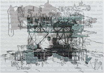 Szabó Zoltán: Erdőlyuggató Erdőlyuggató... Ez egy objektum, amit az emberek hoznak létre, de nem lehet meghatározni a korát. A vidám verzióban ez a táj fölött lebeg valahol. Vannak rajta vitorlák. Mindenféle kifeszített vitorlák, amik a szél által tartják ezt a könnyű dolgot. Ez egy test. A test attól függően barázdált, hogy a többi ilyen hasonló testtel, - amelyek a világ bármely pontján találhatóak - milyen kontextusba kerül, szóval ettől függően torzul mindig. Mivel ez a vidám verzió, ezért csak nagyon kedvesen lyuggatja az erdőt, mert csak enyhe csápjai nyúlnak le, jól kiválasztott helyekre a fák közé. Szóval ez végül is egy emberi lakhely, ami vehető a mostani városok utódjaként is.Valószínűleg egy csomó olyan tulajdonságot hordoznak, amik most a városban megtalálhatóak. Tehát vannak benne járatok, nagy fő elosztóerek, és kisebb lakhelyek, amelyek minden embernek sajátosan vannak tájolva. Ez egy ilyen kisebb város nagyságú test, mint mondjuk Esztergom és mondjuk a Rakodó fölé lenne kikötve. Van egypár darab csápja. És akkor ez nézne Esztergomra. A fene sem tudja, hogy mondjuk akár négyszáz év múlva Esztergomból mi marad, ami fontos. Valami olyat kéne odarajzoli Esztergom helyére, ami fontos. A Rakodó az tuti, az megmarad, esetleg a dombon valami rom is lehetséges, de benőtte biztos az erdő és sok kis emberke lakik benne.