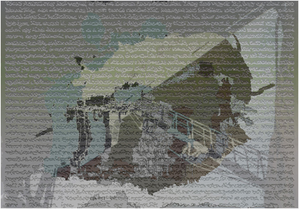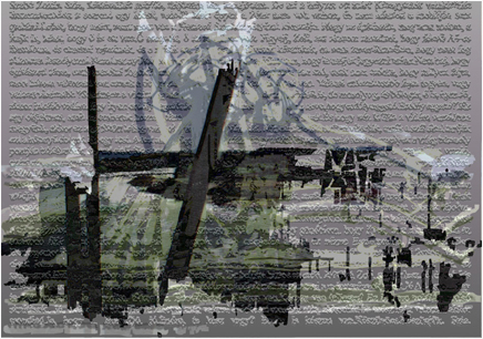 Sugár Péter: Repülő híd Osszuk két részre a rajzlapot, és legyen egy helyszínrajz az egyik fele. A szénrakodótól a híd irányába egy ezerötszáz méter hosszú sodronykötél lenne, ami a szénrakodó vonalában lenne rögzítve. Most ezt az ezerötszáz méter hosszú szakaszt hat részre kellene osztani, hat darab kétszázötven méteres részre, és ezeken a helyeken lennének ilyen úszó hajók, amiknek a mérete tizenkét méter hosszú lenne és három méter széles. Ezeken mindegyiken az utolsó szakaszt leszámítva zászlók és lámpák lennének, amik a vizet világítanák. Szlovák és magyar zászló lenne a kétoldal felé ezekre az oszlopokra erősítve. Na most a legalsó, a híd közelében lévő szakasz egy komolyabb szerkezet lenne.Ha három részre osztanátok az utolsó szakaszt, akkor ezen a három nyolcvan méteres szakaszon lenne egy-egy acélszerkezet, ez tulajdonképpen a Párkánnyal összekötő három darab hiányzó elem.Az eredeti Mária Valéria híd szerkezete pontonokon közlekedne a két part között keresztbe fordítva. Most ennek funkciója is lenne. Az első íves szakaszban kiállítóterem lenne, a második acélszerkezet részben egy kávéház és a harmadikban pedig egy művészeti központ lenne, utalásként erre a kompromittáló helyzetre, melyet mégis elfogadunk és élünk benne.